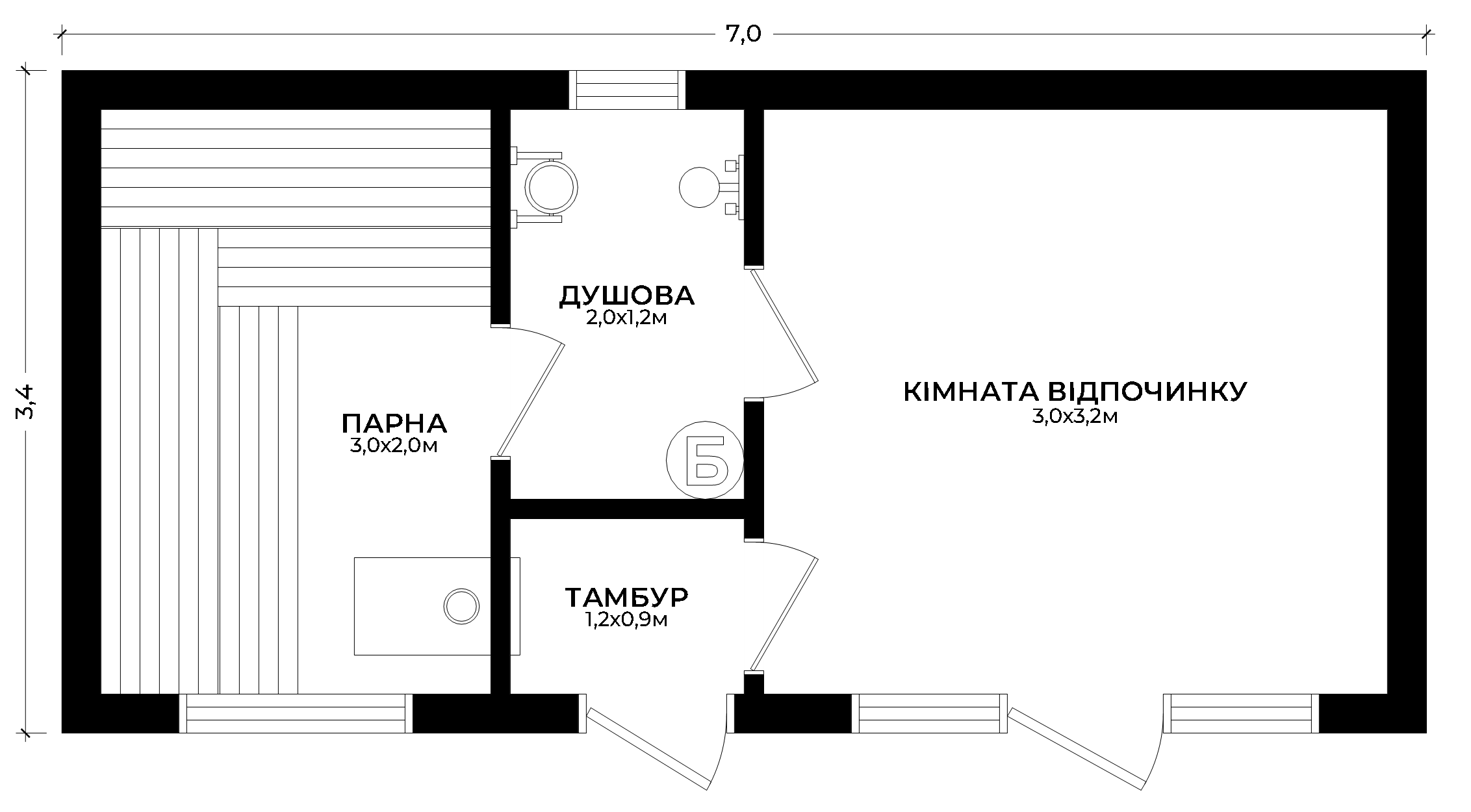 Баня 3,4х7 з тамбуром, душовою і кімнатою відпочинку – 23,8 м²