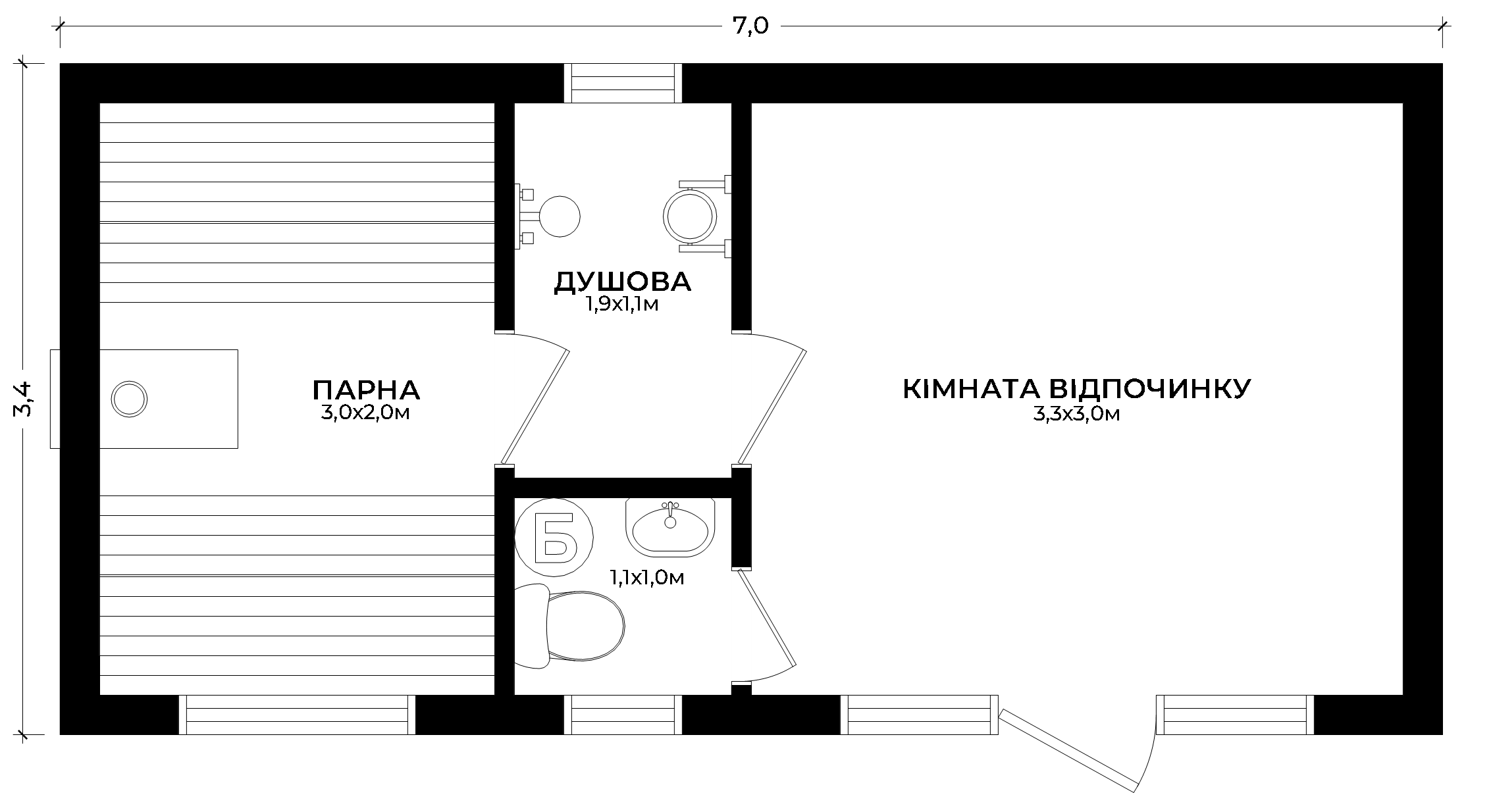 Баня 3,4х7 з тамбуром, душовою і кімнатою відпочинку – 23,8 м²