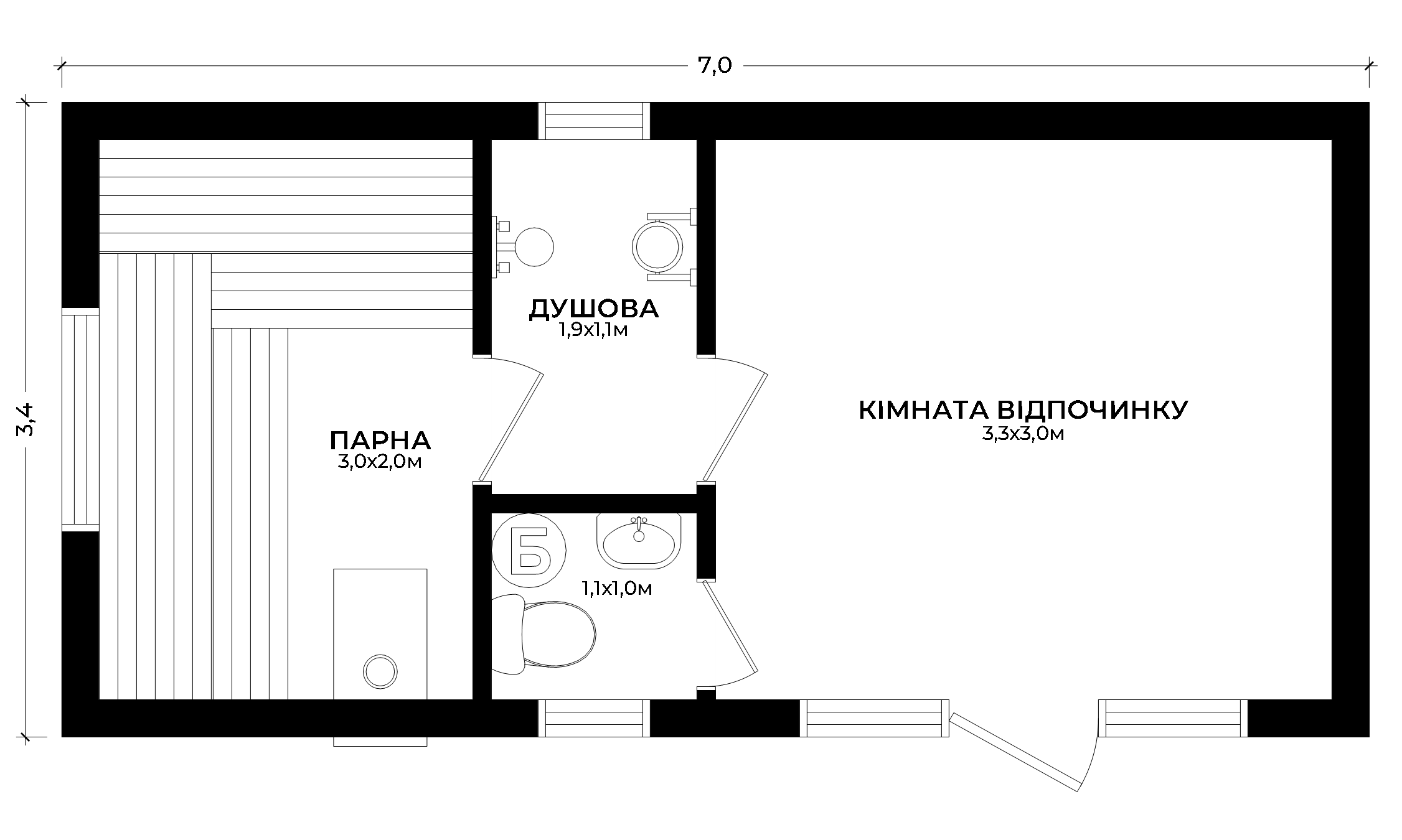 Баня 3,4х7м з душовою, туалетом і кімнатою відпочинку – 23,8 м²