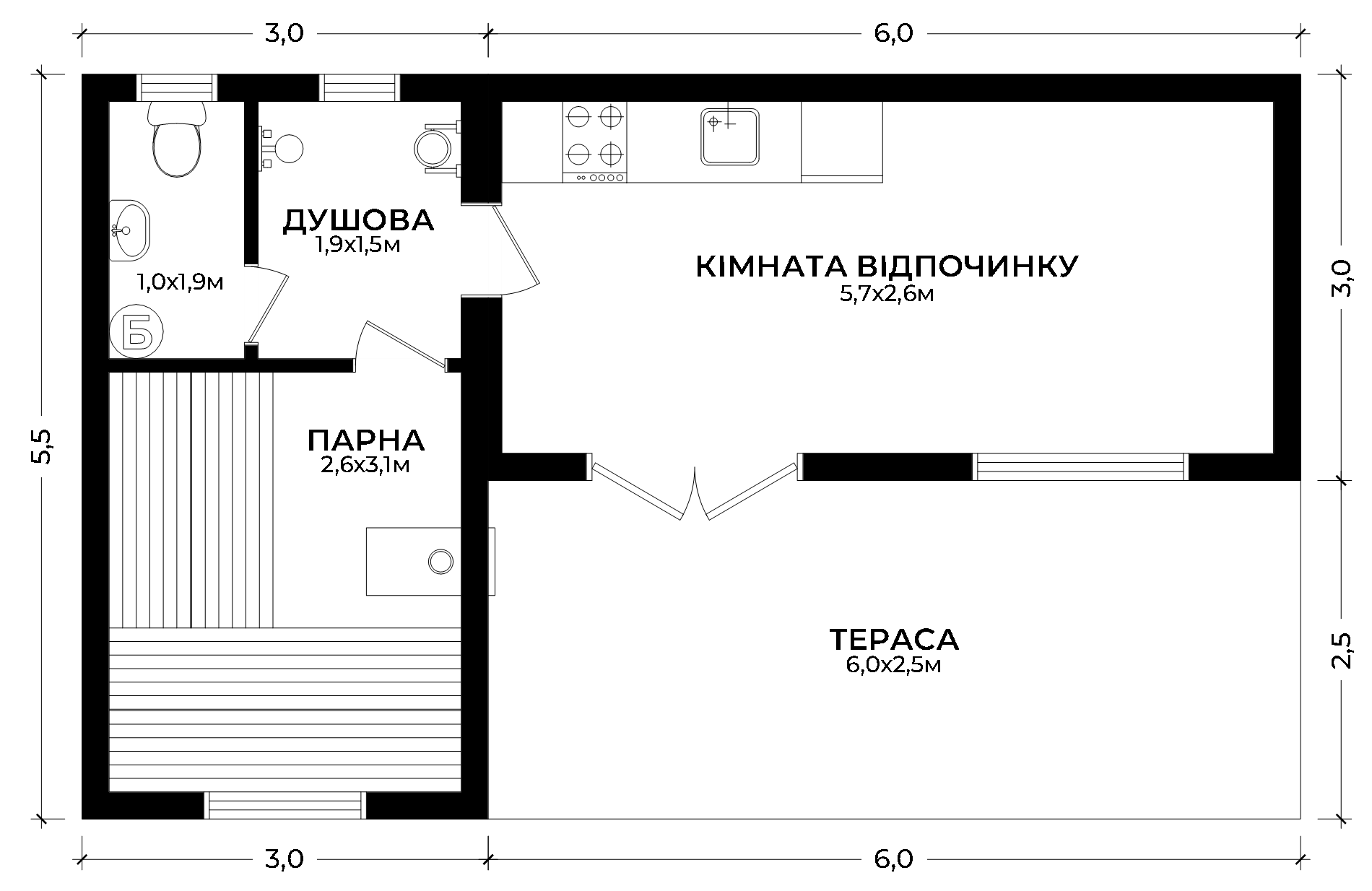 Кутова баня 9х5,5м з кухонною зоною – 28,5 м²