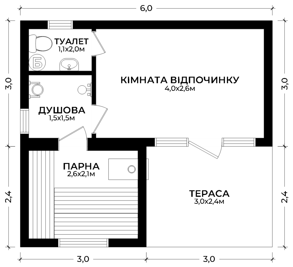 Кутова баня 6,4х6м з душовою і терасою – 24 м²